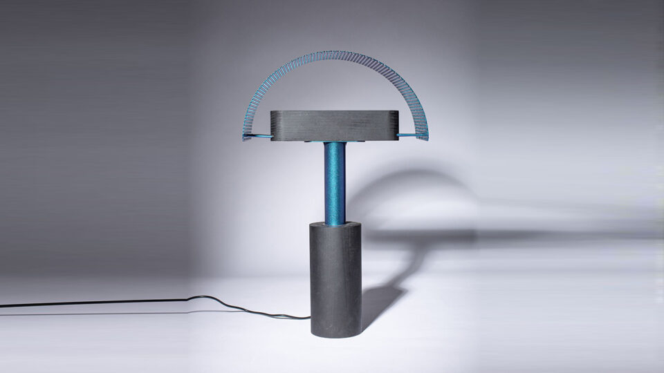 Le piétement et la source lumineuse forment un T. La lampe est composée d’un cylindre en châtaignier peint (noir mat RAL 90005) surmontée d’une tige laquée bleue. A la perpendiculaire, la source lumineuse (ruban LED linealight) est incrustée dans un corps oblong en châtaignier peint en noir. L’abat-jour convexe (rectangle courbé) en tôle perforée (Mevaco R4T6 ép. 1,5 mm) laqué bleu est maintenu par deux fines tiges métalliques laquées bleu fixées de part et d’autre du corps oblong.